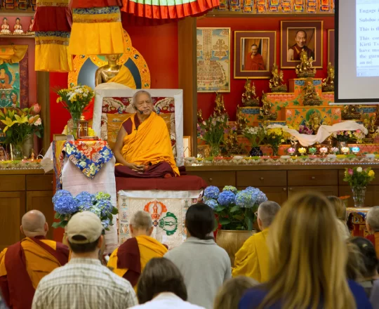 Khadro-la teaching at Tushita Meditation Centre, McLeod Ganj, India, March 9, 2014. Photo courtesy of Tushita Meditation Centre.