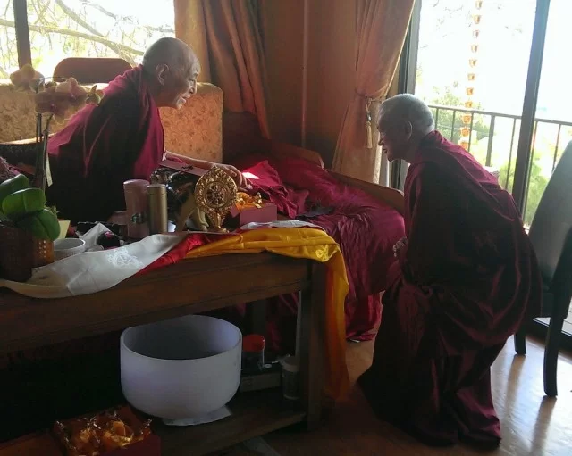 Lama Zopa Rinpoche visiting H.E. Choden Rinpoche, San Jose, California, September 30, 2013. Photo by Ven. Roger Kunsang.