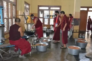“Kitchen work begins at 4:00 a.m. every day. The on-duty cooks initiate all the preparatory work like pre-heating the hot plate used to make bread. All resident monks enrolled in the geshe studies program, with the exception of those in the very senior classes, have to take turns to help with kitchen work for two days every month. Every day, between 50 and 70 monks are assigned to kitchen work.” More….