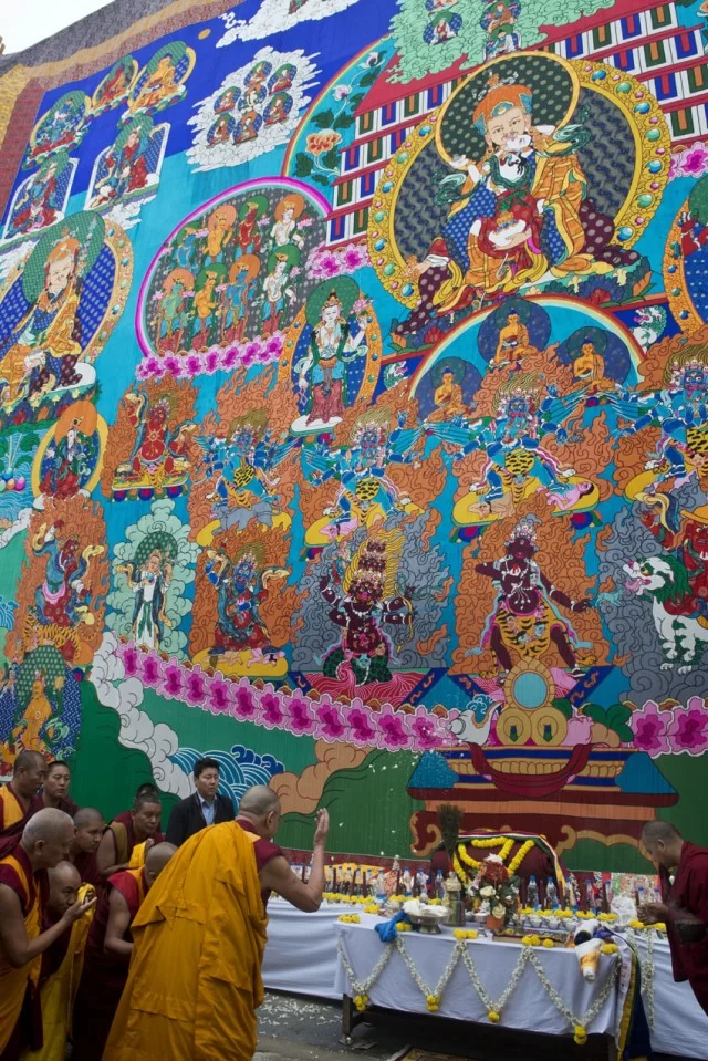 The impressive thangka, which with its brocade board measures 90-feet (27-meters) wide by 70-feet (23-meters) high, took two years to make and was completed in 2013. It is for the Guru Rinpoche Bum Tsog (100,000 tsog offerings) in Nepal.