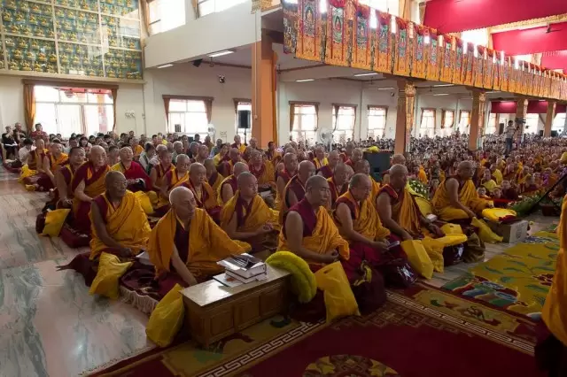 Over 40,000 Sangha attended the Jangchup Lam-rim teaching event including many high lamas. Lama Zopa Rinpoche can be seen with Choden Rinpoche in the fourth row of this photo.