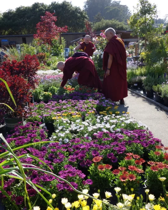 Rinpoche choosing flowers for offerings, Aptos, California, May 2014. Photo by Ven. Roger Kunsang.