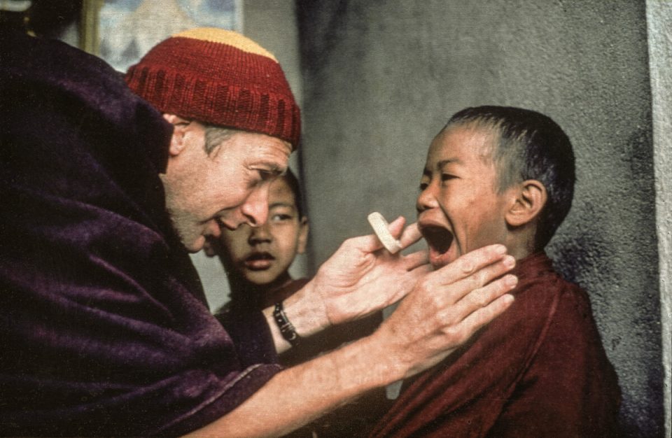 Dr. Adrian Feldmann (Ven Thubten Gyatso) treating a young monk at the People’s Clinic, Kopan Monastery, 1979. Photo courtesy of the Lama Yeshe Wisdom Archive.