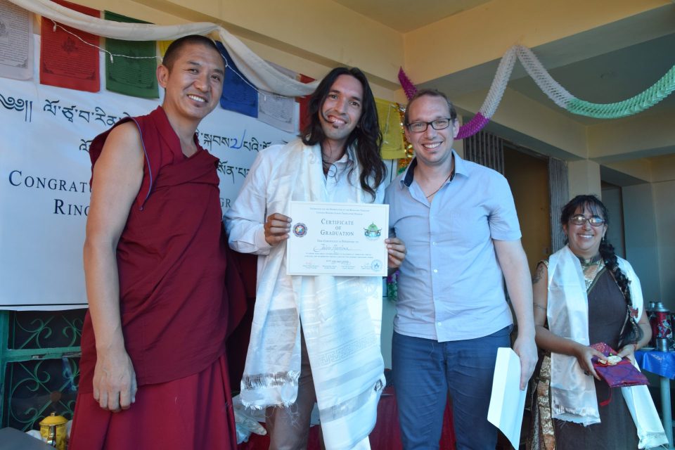Geshe Wangdak in 2017 with Jairo, Yaron, and Martha during the LRZTP 7 graduation ceremony.