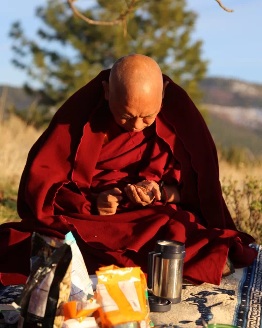 Lama Zopa Rinpoche making offerings to ants at Buddha Amitabha Pure Land in north central Washington, US, April 2014. Photo by Ven. Thubten Kunsang.