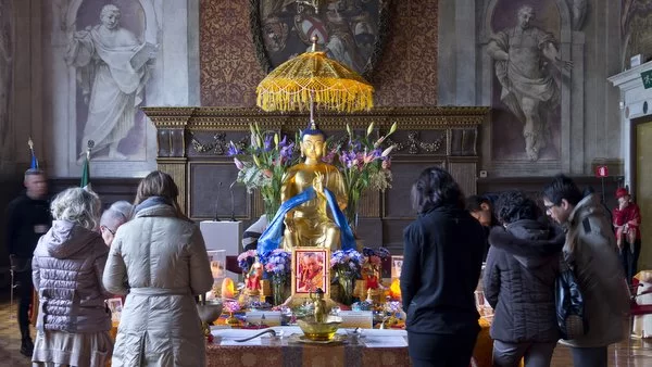The Maitreya Heart Shrine Relic Tour visits Palazzo della Gran Guardia in downtown Padova, Italy, February 2013. Photo by Flavio Zanchetta.