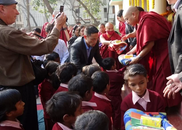 His Holiness the Karmapa offers gifts to Maitreya School children, Bodhgaya, India, January 31, 2014. Photo by Ven. Roger Kunsang.