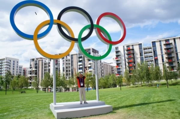 Geshe Tashi Tsering under Olympic rings, London, England, July 2012