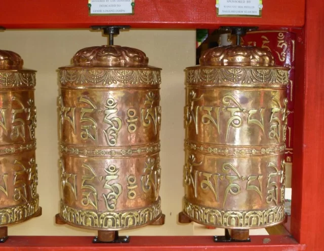At the Garden of Enlightenment, a project of Chenrezig Institute in Queensland, all of the spaces for prayer wheels along the front wall of the main shrine building are now taken. The main building of the stupa garden serves as the base for eight great stupas, the largest of which is 10 meters (33 feet) tall. The shrine and stupas are surrounded by ornamental gardens. The prayer wheels along the front wall are colored wheels and were made at the Chenrezig art studio. They are very difficult to construct and expensive to produce. So on a recent trip to Kopan Monastery in Nepal, we looked at copper and brass wheels and decided to use the Nepali wheels for the remaining walls. They are far more practical, will last longer and, because of their slightly smaller size, we can fit many more prayer wheels along the walls. We received the first shipment of ten in April and already six have been sponsored.