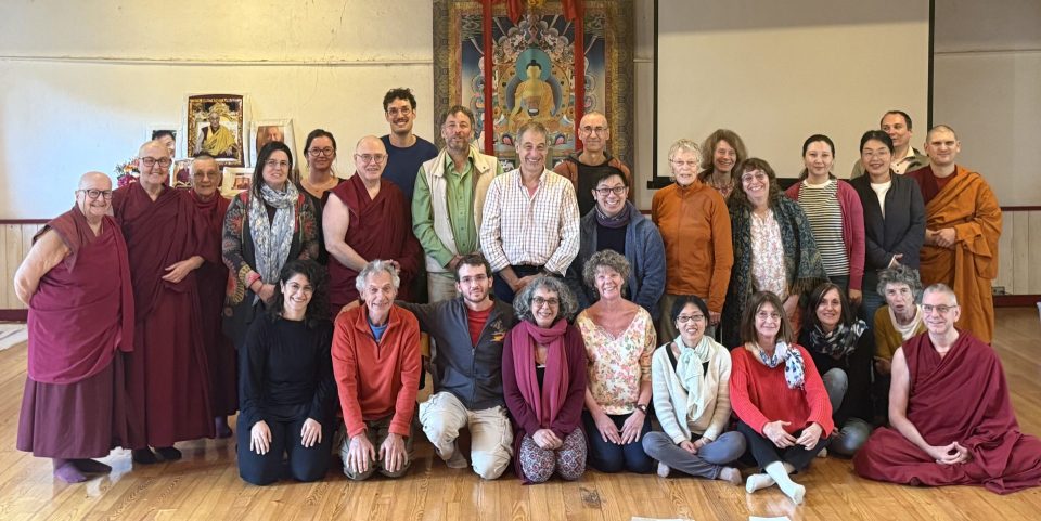 Some of the participants of the first Heart Sutra retreat in Europe, with retreat leader Stefano Gaviglio, center, in the Chenrezig Gompa at Istituto Lama Tzong Khapa, Italy, July 27, 2025.