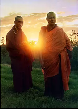 Lama Thubten Yeshe and Lama Zopa Rinpoche at dawn, Chenrezig Institute, Saka Dawa 1975. Photo: Nick Ribush