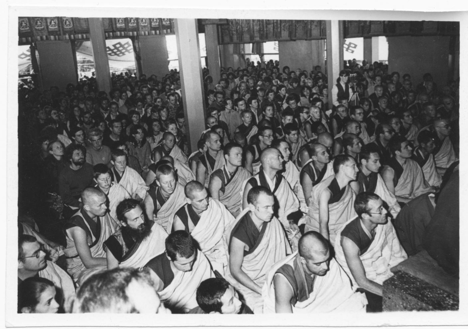 FPMT Sangha during His Holiness the Dalai Lama’s teachings on Mahamudra, March 1982. Robyn Brentano can be seen behind the camera near the pillar in the upper right. Photographer unknown. photo courtesy of Robyn Brentano.