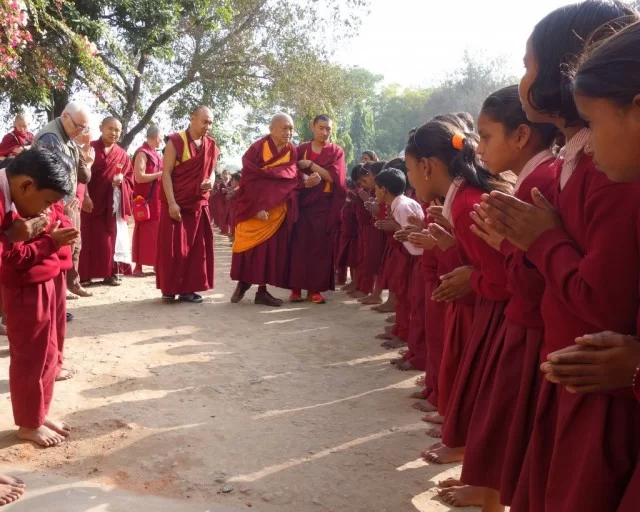 Lama Zopa Rinpoche arriving at Maitreya School, a project of Root Institute, Bodhgaya, January 2014. Photo by Ven. Roger Kunsang.