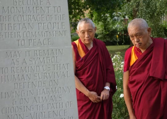 Lama Zopa Rinpoche with Geshe Tashi, resident geshe at Jamyang Buddhist Centre, visiting the the Tibetan Peace Garden next to the Imperial War Museum in London, UK, July 2014. Photo by Ven. Roger Kunsang.