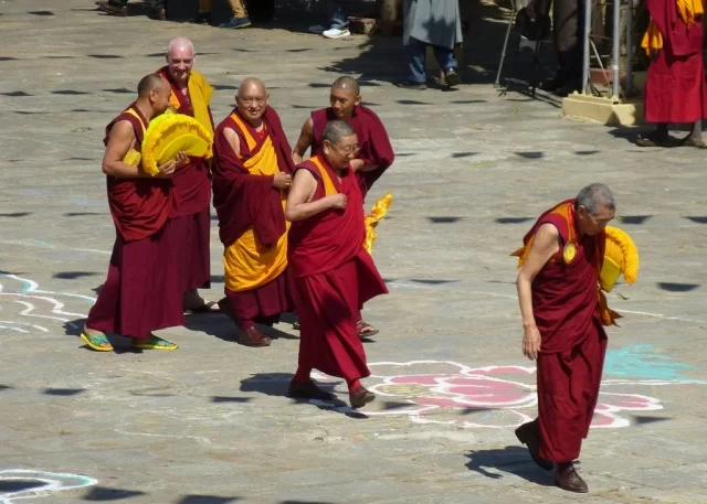 Photographer Melissa Mouldin caught sight of Lama Zopa Rinpoche at Sera that same day. She shared some of her photos of Rinpoche greeting many people, including Khadro-la (Rangjung Neljorma Khadro Namsel Drönme) and several Western students.