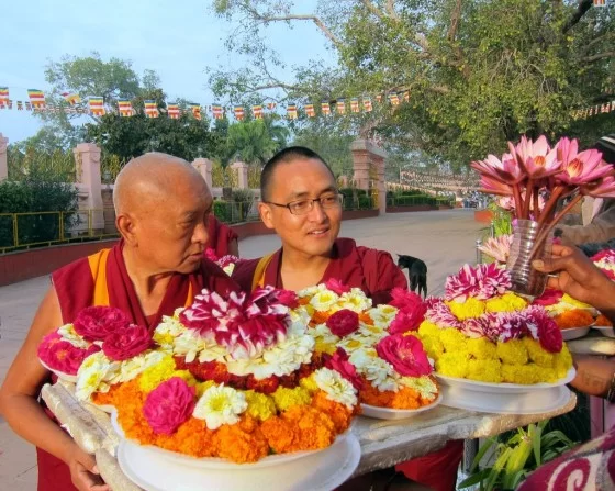 Lama Zopa Rinpoche buying extensive flower offerings at the Mahabodhi Stupa, Bodhgaya, India, February 2014. Photo by Ven. Sarah Thresher.