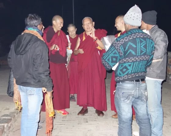 On the way down from Vulture’s Peak, Lama Zopa Rinpoche stops to give teachings to the local Indians who sell things, February 2014. Photo by Ven. Roger Kunsang.