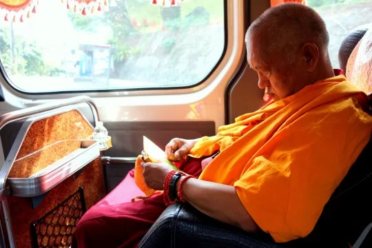 Lama Zopa Rinpoche on the way to opening of renovated Jinsiu Farlin, Taipei, Taiwan, April 2014. Photo by Ven. Roger Kunsang.