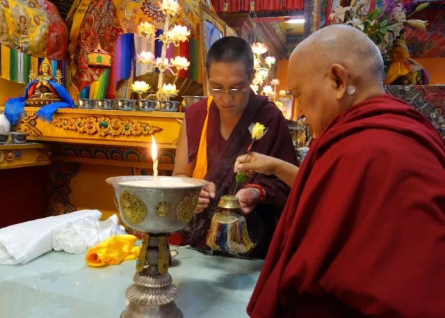 Lama Zopa Rinpoche offering a butter lamp upon arriving at Kopan Monastery, Nepal, November 22, 2013. Photo by Ven. Roger Kunsang.