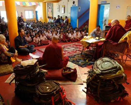 Lama Zopa Rinpoche giving a talk to the students of Maitreya School at Root Institute, Bodhgaya, India, March 2014. Photo by Ven. Roger Kunsang.
