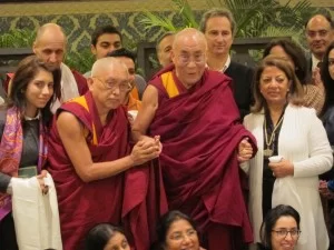 In the morning we had a small group appointment with His Holiness. Lama Zopa Rinpoche was running late for the appointment and arrived at the hotel just behind His Holiness. His Holiness turned around to find Rinpoche behind and jokingly said, “You’re behind me, you’re supposed to be in front of me,” and then took Rinpoche by the hand and went into the small meeting room.