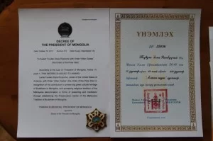 President of Mongolia presents the "Order of the Polar Star" Mongolia's highest award for foreigners for distinguished service to Mongolia.