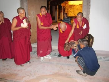 A goat is standing by a shop, tied on a very short leash. It is waiting to be killed by the butcher. I am not sure if it is aware it will be killed very soon. Rinpoche asks the jeep to stop as soon as he sees the goat. It is a nice looking, strong and young goat, brown colored with spots all over it. The negotiations start immediately with the shopkeeper. How much does he want for the goat? He discusses it with his friend in the shop and we settle on 8,500 rupees (about US$ 119), the cost of a cheap cell phone. The man explains that now they will get another goat because they have a commitment to get meat for the weekend. Rinpoche immediately starts negotiating for the second goat. I wonder to myself how long is this going to go on! We settle on the price for the second goat. Then we drive off to Kopan Nunnery and the two goats are brought there soon after. Rinpoche blesses both the goats. They look happy!