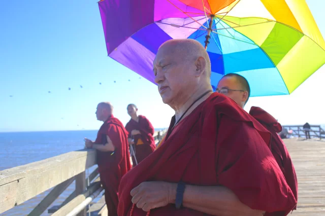 Watch Lama Zopa Rinpoche as he blesses all the sentient beings in the ocean. While Rinpoche has been staying in California, he frequently goes with Sangha and Namgyälma mantra boards to a wharf near Kachoe Dechen Ling or to the beach. The mantra boards are placed in the water and Rinpoche chants mantras, says prayers and pours blessed water into the ocean.