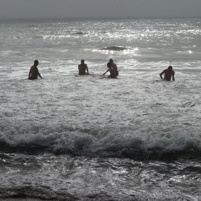 Vens. Tsering, Namgyal, Sangpo, Sherab and Roger guiding the large Namgyälma mantra board through the waves while a dolphin swims by in the background, California, October 26, 2013. Photo by Ven. Holly Ansett.