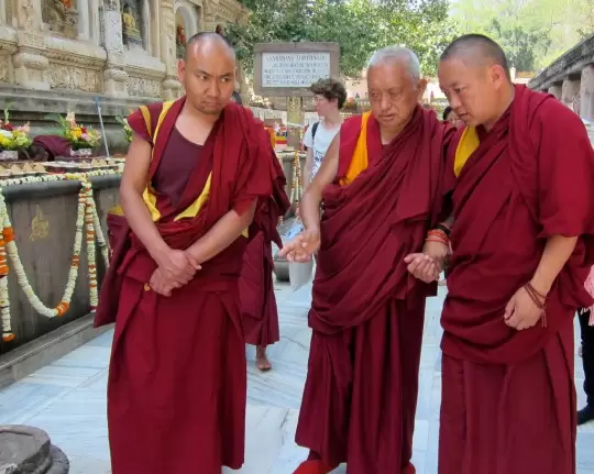Lama Zopa Rinpoch making extensive prayers and dedications, Mahabodhi Stupa, Bodhgaya, India, March 2014. Photo by Ven. Sarah Thresher.