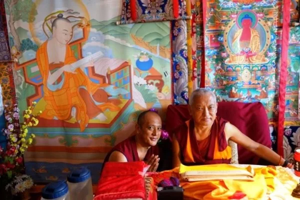 Lama Zopa Rinpoche with Geshe Deyang, resident geshe of Chokyi Gyaltsen Center, Kopan, Nepal, May 2013. Photo by Ven. Roger Kunsang.