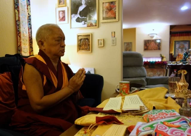 Lama Zopa Rinpoche praying at Kachoe Dechen Ling, Aptos, California, US, November 11, 2013. Photo by Ven. Roger Kunsang.