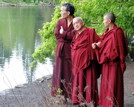 Lama Zopa Rinpoche with Yangsi Rinpoche (left) and Ven. Sangpo visiting Crystal Springs Rhododendron Garden in Portland, Oregon, US, April 2014. Photo by Ven. Holly Ansett.