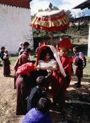 Publicly displaying a religious statue in Bhutan. Photo by John Berthold.