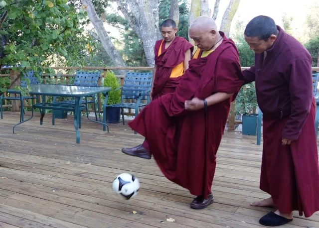 In October 2013, while at Kachoe Dechen Ling in California, Lama Zopa Rinpoche occasionally played with a soccer ball after lunch as a way to exercise and build up strength and coordination in his right arm and leg, which were affected by the stroke he manifested in 2011. Ven. Roger Kungsang, Rinpoche’s assistant, captured photos of Rinpoche and Sangha playing with a soccer ball one day during an exercise session.